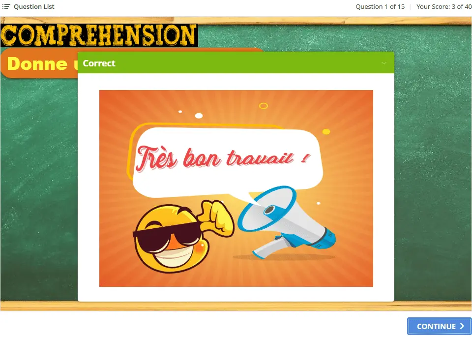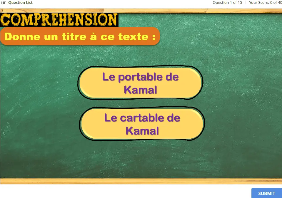 لهذا الغرض، نقدّم لكم هذا الامتحان الموحد التفاعلي في اللغة الفرنسية، المصمم خصيصًا ببرنامج iSpring Quiz Maker، ليمنح التلاميذ تجربة تعلم ممتعة تجمع بين التقييم، والتصحيح الفوري، والمؤثرات التفاعلية المشوقة.