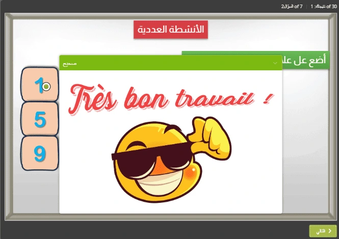 فكل إجابة صحيحة تُكافأ بصوت تشجيعي ورسوم متحركة مرحة، ما يجعل التلميذ يشعر وكأنه في لعبة تعليمية ممتعة تزيد من رغبته في مواصلة التعلم.