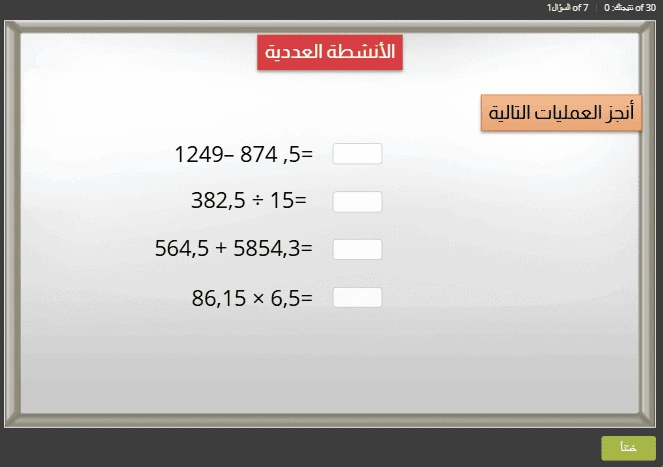 يُعد هذا الامتحان التفاعلي في مادة الرياضيات وسيلة حديثة لتثبيت المفاهيم الرياضية بطريقة محفزة وممتعة، تجمع بين اللعب والتعلم.